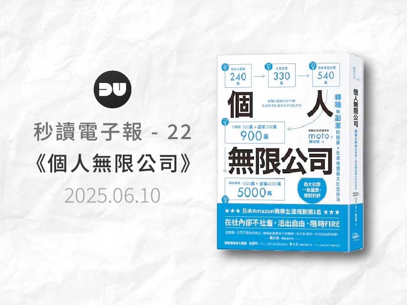 靠轉職與副業的「相乘效果」,才能在快速變化的時代,最大化個人價值與生涯年收入。 這個概念,來自日本資深職涯顧問 moto 所寫的《個人無限公司》。 作者 moto 並非名校畢業,也不是那種自帶光環的職場天才。 為了及早出社會賺錢,他從短期大學畢業後,試過到處應聘各種高收入的職缺,卻總是被一道「學歷」的隱形門檻給拒於門外。 於是他轉頭,把年薪 240 萬「日圓」的大賣場店員當成職涯的起點,並從那時起主動開啟了他的轉職人生。 十年後,透過四次目標明確的轉職與副業,成為年收五千萬日圓的頂級上班族。 並把他多年來的心法,打造成一套可以被複製的職涯升值系統。 不需要離職創業、更不必總是追求那些門檻高到自己跨不過的高級職缺,作者想要傳達給我們的理念是: 如何「有目的性」地運用職涯中的每一份經驗,打造一間屬於你自己的「個人股份有限公司」。 核心觀點一:公司沒有義務養你一輩子 作者 moto 是日本人。 也許不少人知道,日本的職場文化非常重視忠誠,甚至有許多大企業實行「終生雇傭制度」。 不過作者也在開篇的序章就提到,這個制度正在瓦解。...